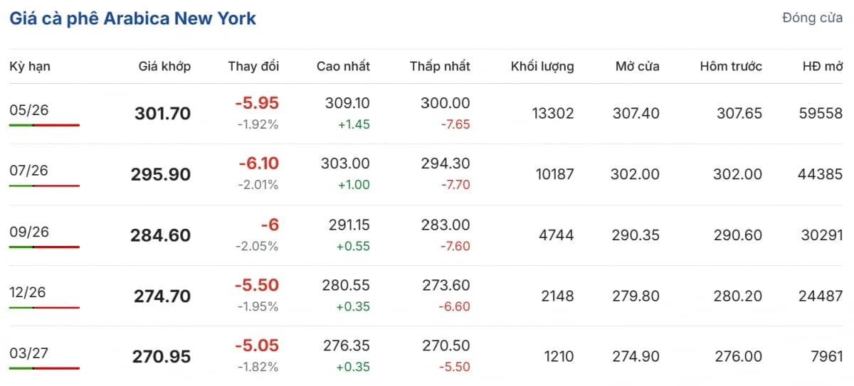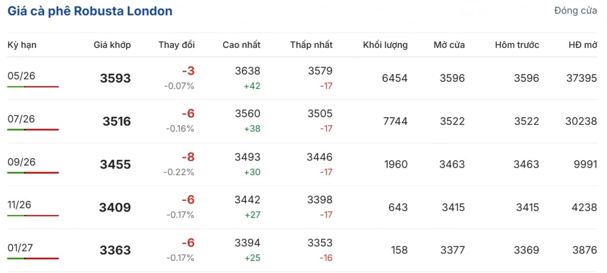 Robusta prices on the London exchange decreased slightly across all contracts. Specifically, the May 2026 contract fell by $ 3/ton (-0.07%) to $ 3,593/ton; the July contract dropped by $ 6/ton (-0.16%) to $ 3,516/ton; while the September contract lost $ 8/ton (-0.22%) to $ 3,455/ton.