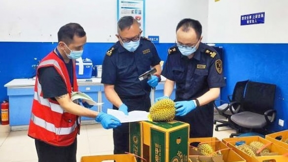 Guangzhou customs officers inspecting imported durians. Photo: China News.