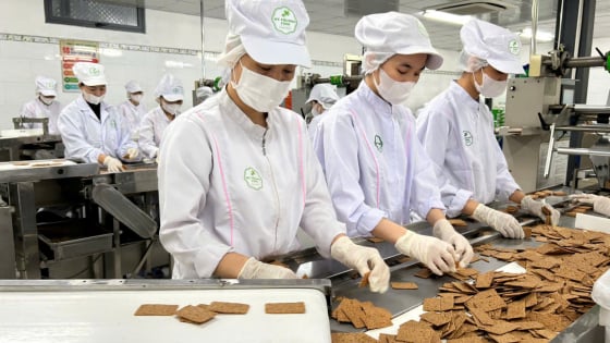 The production line at My Phuong Food is busy filling roasted coconut cake export orders.