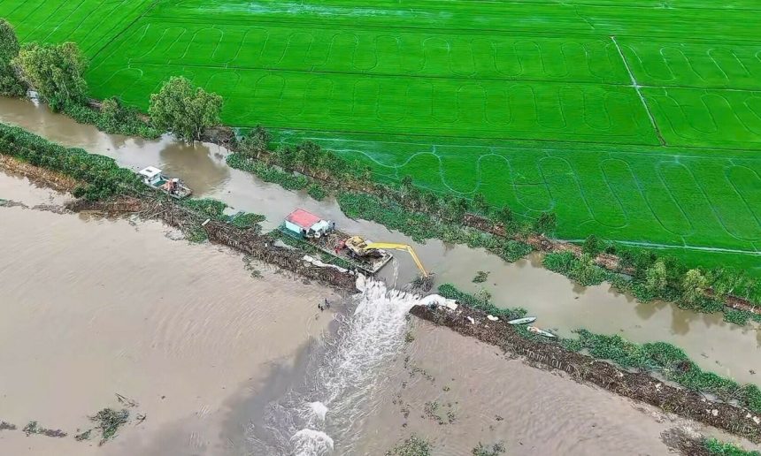 The 155-hectare dike, Phuong Thinh commune, Dong Thap province, broke on October 23. Image: Nguyen Khanh